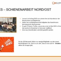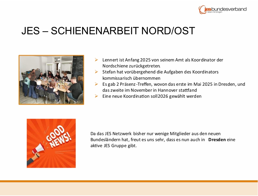 Neben der Vorstellung des Tätigkeitsberichts durch die Verantwortlichen, wurden diese sowie die Kassenprüfenden des JES-Netzwerks (wieder) gewählt. Thekla Andresen, Sabrina „Bina“ Klier & Stefan Ritschel wurden durch die Mitglieder zu den Verantwortlichen für das JES-Netzwerk gewählt. Frank Rudolph stellte sich erneut für das Amt des Kassenprüfers zur Verfügung und wurde von der Mitgliederversammlung bestätigt. Dirk Schäffer übernimmt die Vertretung und ebenso durch die MV bestätigt.